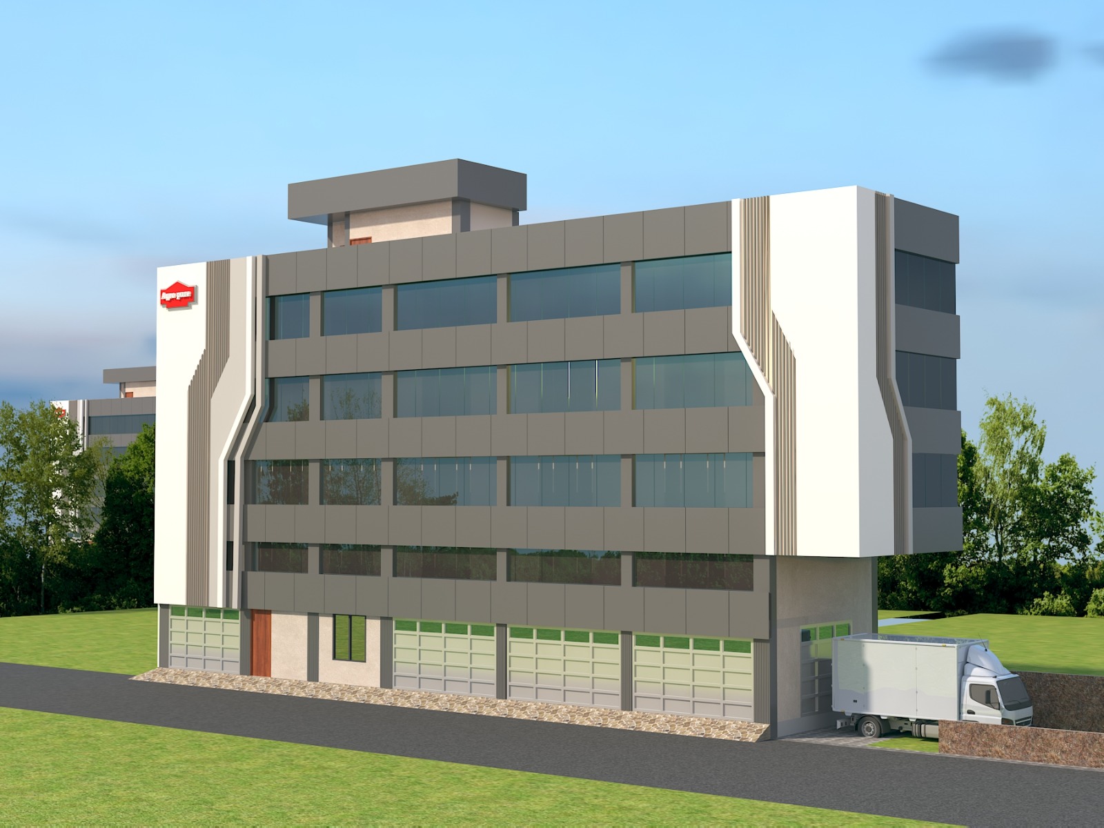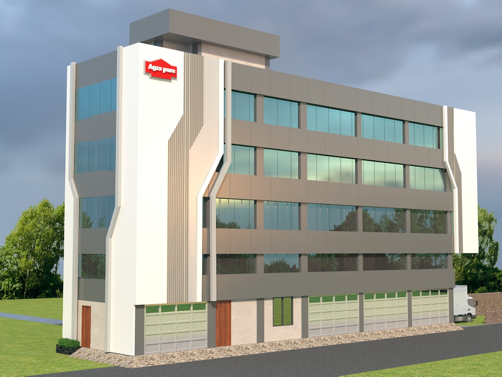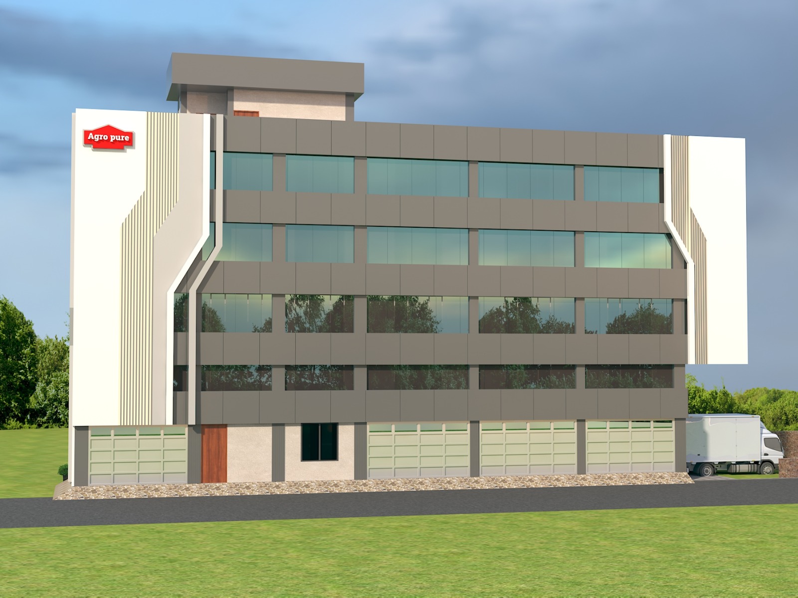 The Agropure Office Block in DSIIDC Narela is a modern industrial–office facility planned across 3000 sq.ft. The building features a clean corporate façade with streamlined glazing, vertical design accents and a strong visual identity that reflects the Agropure brand.