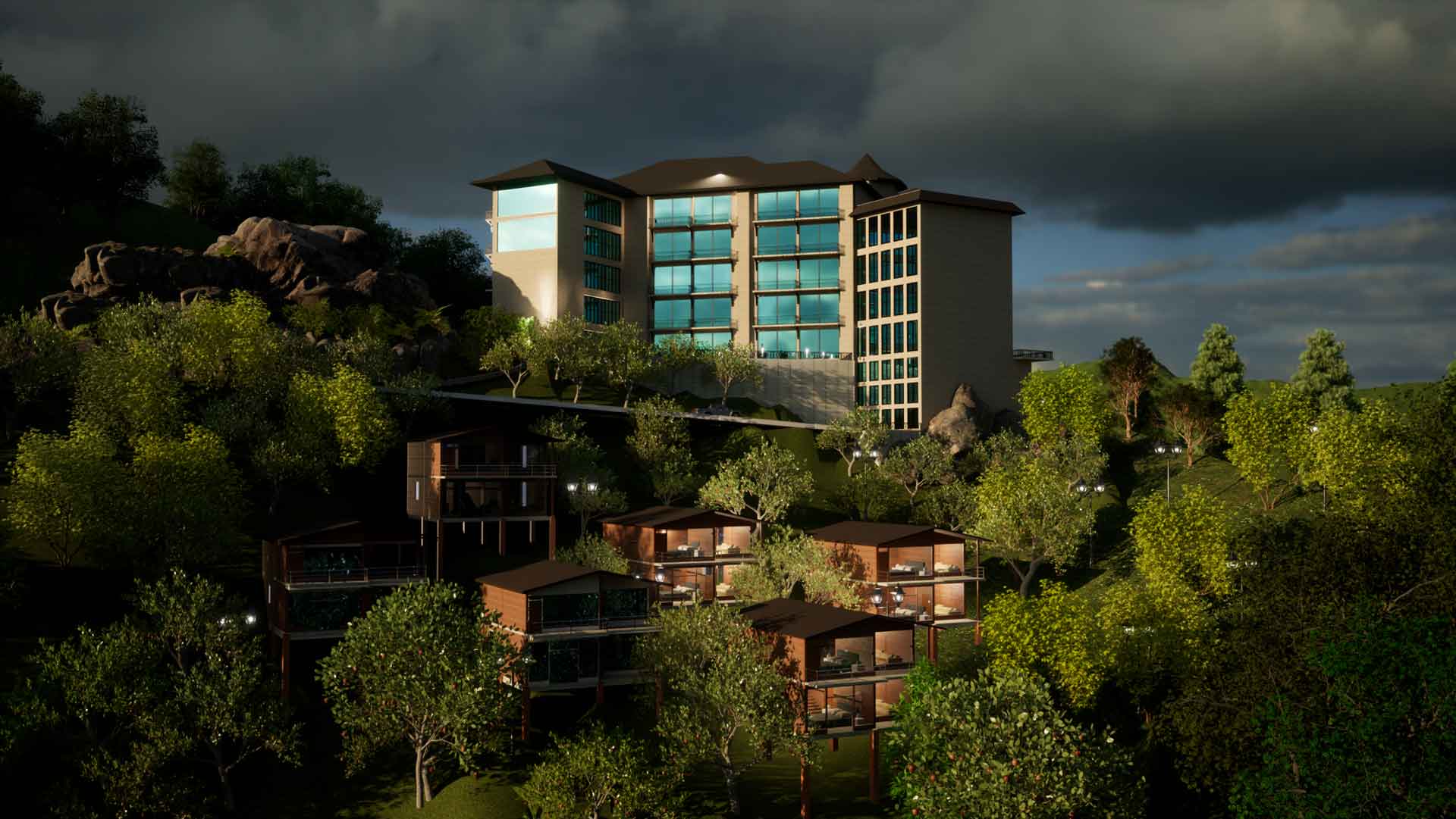 The resort incorporates the main hotel block and a series of cottages on a vast and steep site overlooking the magnificent Himalayan range. The main block of the hotel overlooks the valley and provides a gathering space & to connect all the main services of the hotel: the reception, restaurant, bar, boutique, library, recreational space and more.