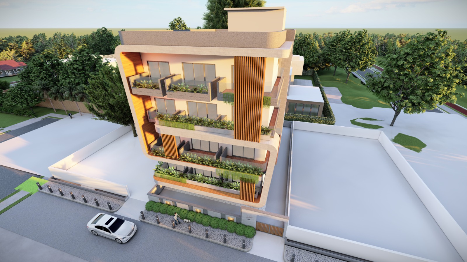 This Residential House in New Friends Colony is a contemporary urban home designed to balance privacy, comfort and refined aesthetics. The façade features clean lines, layered balconies, vertical wooden fins and integrated green planters, creating a warm yet modern architectural expression.