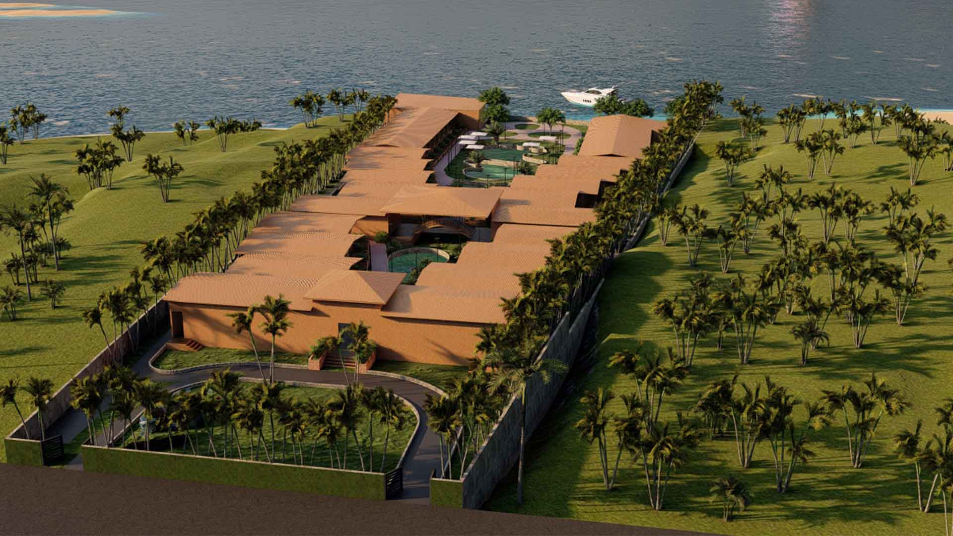 Site is sea facing property of hill. This resort in Morjim beach is an exceptional project due to it's brilliant location and is designed in such a way that all the cottages are getting the sea view. The topography of the site gave us the opportunity to play with the levels. There are 43 cottages in total and we have managed to give each and every cottage a magnificent sea view. The project is inspired by the surroundings and totally integrated with environment.