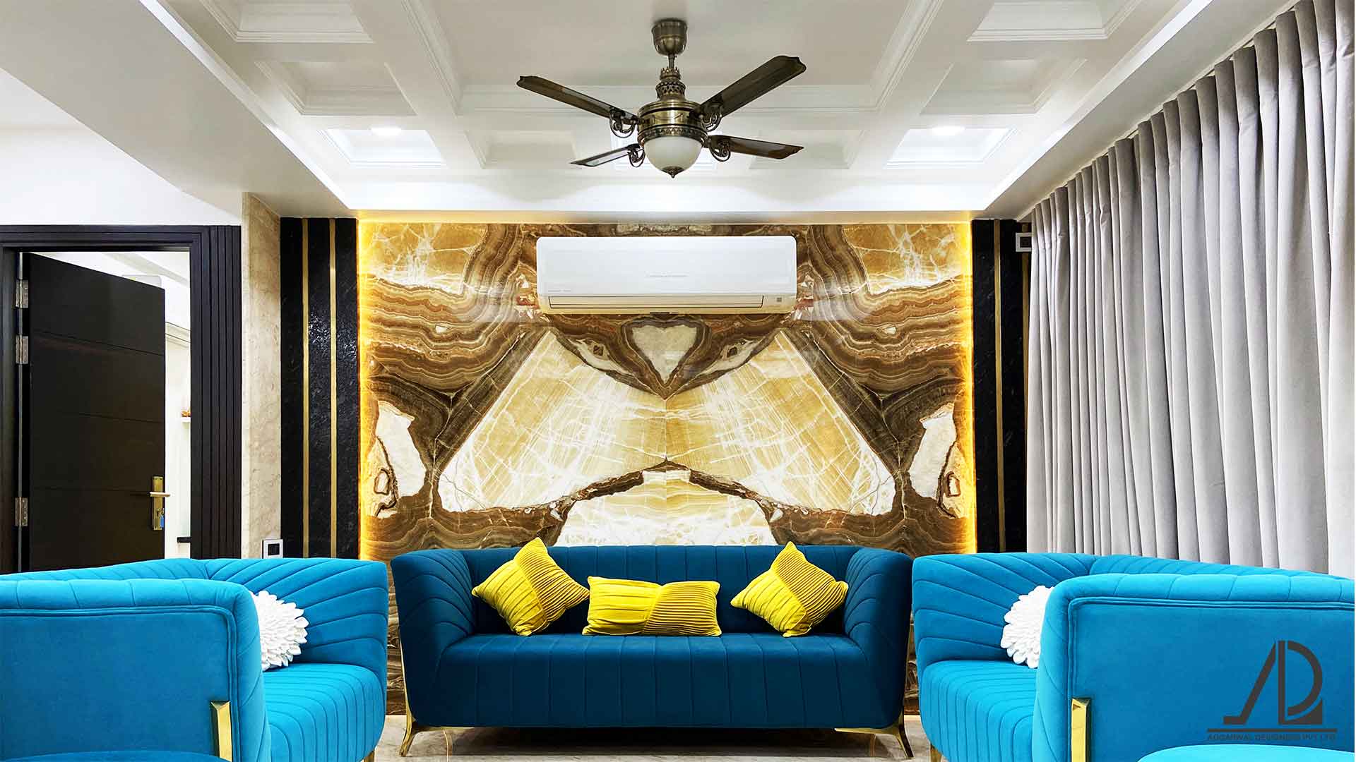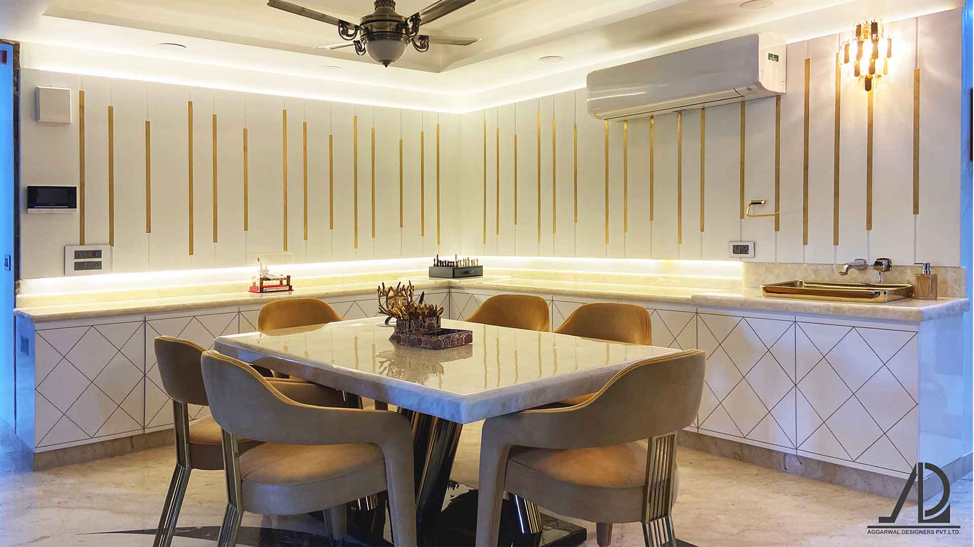 This sprawling 2800 Square-foot abode in Delhi is laden with thoughtfully harmonized décor. Designed for a lovely family of five, every space flows seamlessly into one another whilst maintaining a distinct character of it's own. Adhering to the client brief, incorporating the concept of open-plan dining and living makes for a grand opulent sight at the entrance. Thus, the open plan doubles as an intimate party place to entertain a large gathering of friends and family. Since the clients are a well-travelled couple with an inclination to rich luxurious aesthetics, each space is designed with focus on luxurious clean aesthetics.