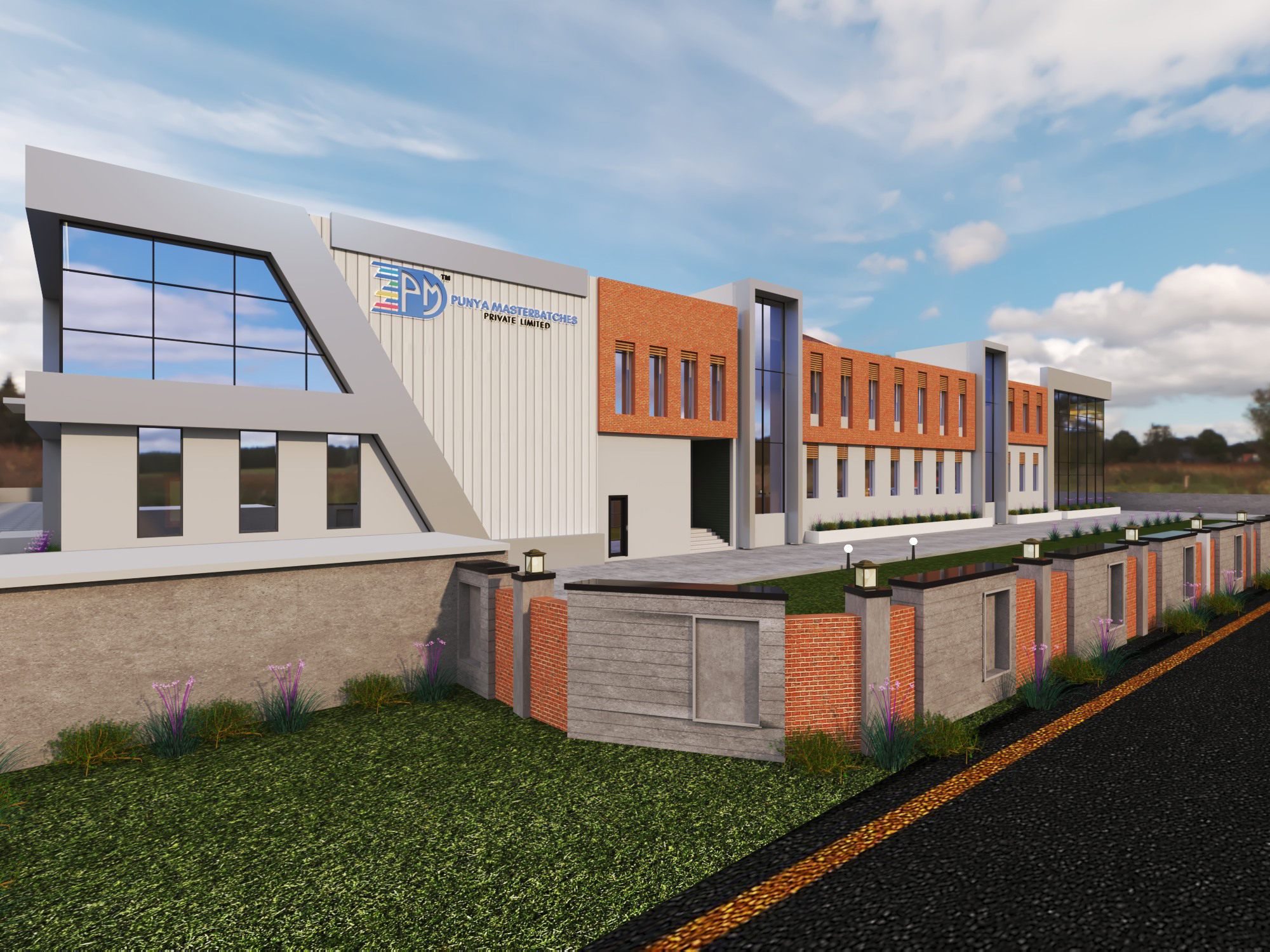 The industrial facility for Punya Masterbatches is designed to address the region's extreme climatic conditions while prioritizing sustainability and energy efficiency. The architecture seamlessly combines functionality with aesthetic appeal, ensuring it meets both operational and visual standards. A key design feature is the integration of the company’s branding elements into the architecture. The logo’s primary color stripes are creatively reflected on the sheeting across three sides of the building, giving it a distinctive and cohesive identity.
