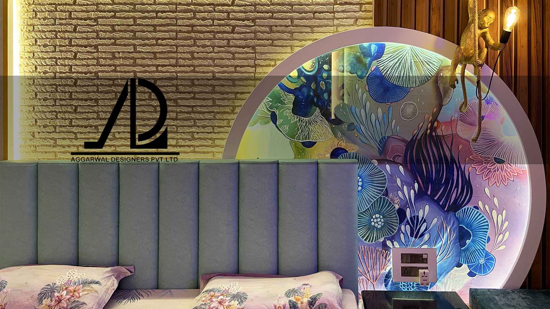 The Main bedroom speaks of luxury combined with intimacy. The intricate amalgamation of Italian stone with gold glass adds an uber luxurious feel to the master. The balcony makes for a comfortable space to breathe in fresh air with the morning tea with a backdrop of a vertical green wall. A customised cosy bedding with ample storage to store and enjoy one’s favourite book in the evening. For the elder daughter’s bedroom, we decided to go for a customised hand painted glass painting and added a hint of rawness with wooden battens and textured brick tiles. The overall aesthetic for this room is of a young dynamic bedroom. The Kitchen is custom made to cater to the client’s requirement of extra storage with a neutral nature-inspired colour palette.