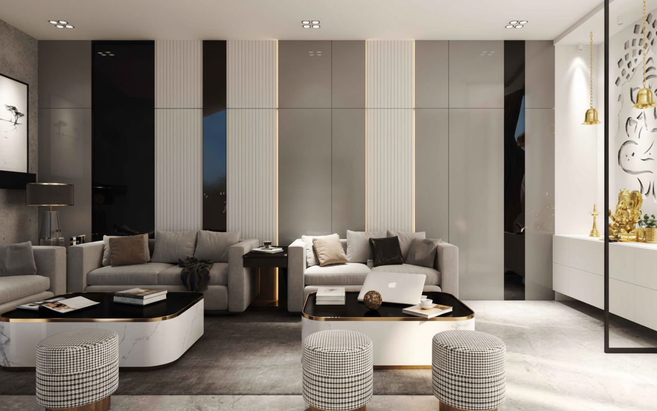 This sprawling 2800 Square-foot abode in Delhi is laden with thoughtfully harmonized décor. Designed for a lovely family of five, every space flows seamlessly into one another whilst maintaining a distinct character of it's own. Adhering to the client brief, incorporating the concept of open-plan dining and living makes for a grand opulent sight at the entrance. Thus, the open plan doubles as an intimate party place to entertain a large gathering of friends and family. Since the clients are a well-travelled couple with an inclination to rich luxurious aesthetics, each space is designed with focus on luxurious clean aesthetics.